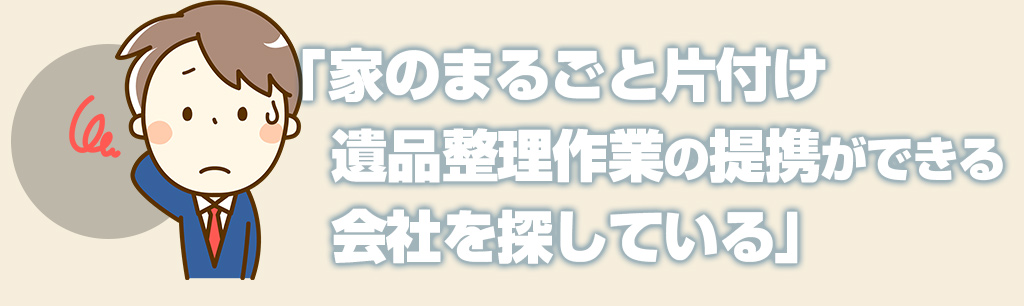 - マンションやアパートから転居するときの大掛かりな家の片付け・遺品整理の提携ができる会社を探している