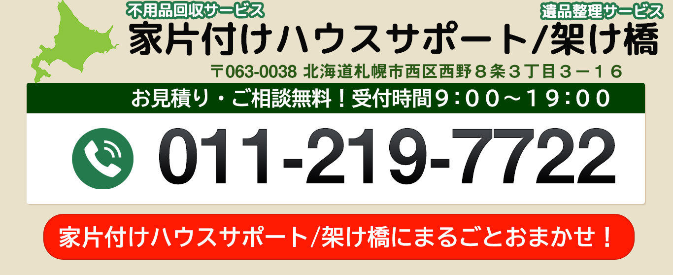 遺品整理の架け橋/家片付けハウスサポートは、札幌市を中心に北海道内で遺品整理・生前整理・不用品回収など家まるごと片付けサービスを行っている会社です。一軒家やマンションなどの不用品回収・処分などのサービスを提供しています。